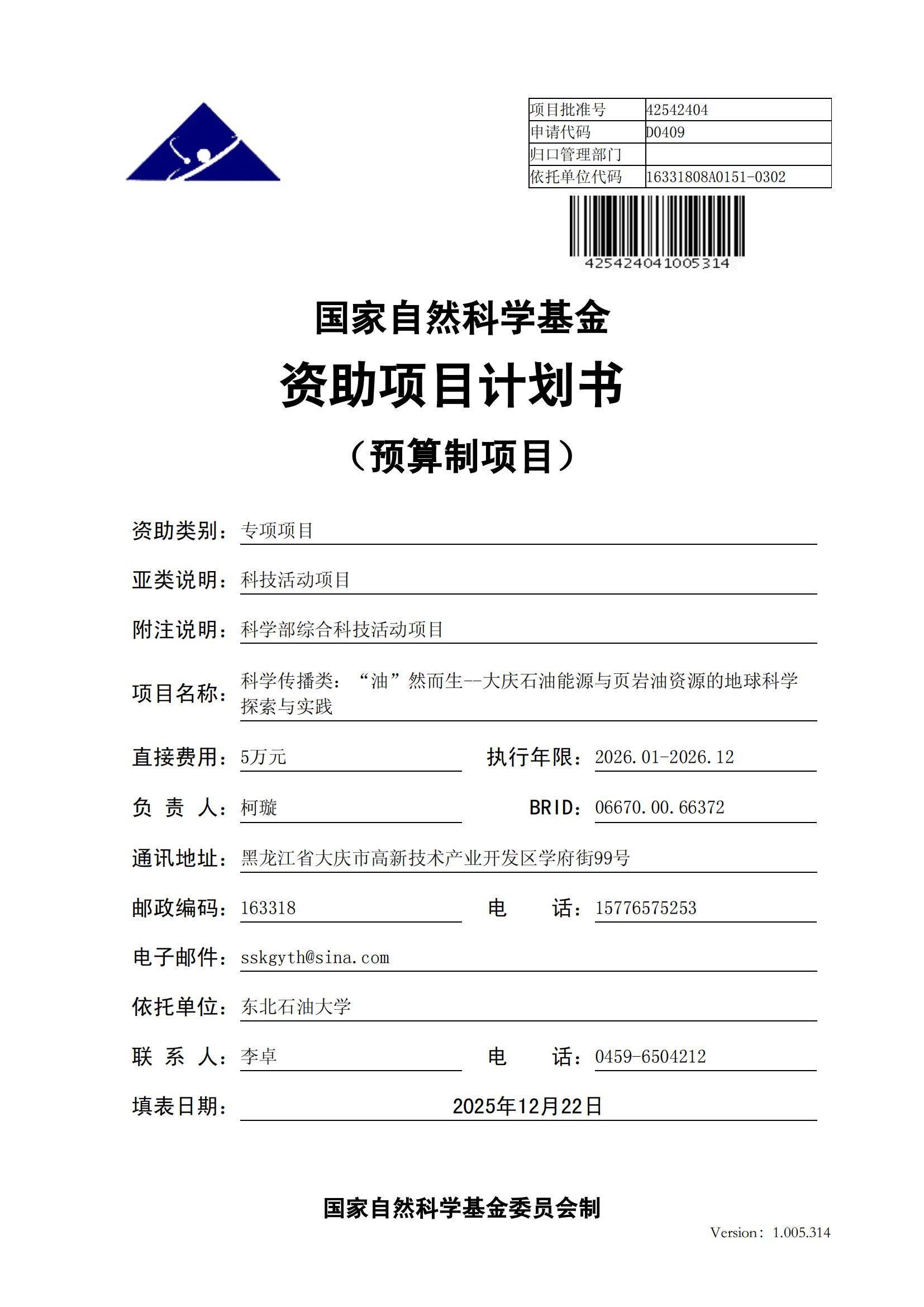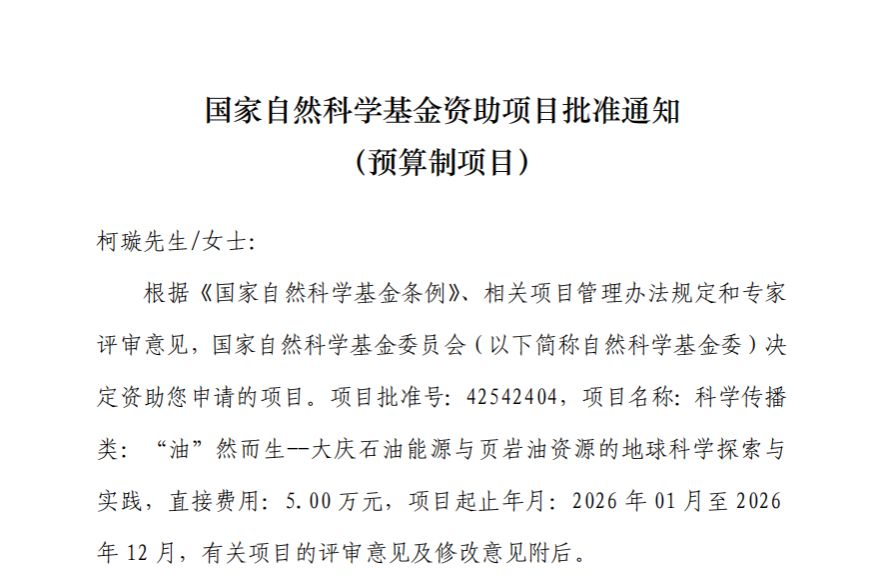 近日,国家自然科学基金委员会公布地球科学部科技活动项目立项结果。Ky开元柯璇副教授牵头申报的科学传播类项目《“油”然而生 —— 大庆石油能源与页岩油资源的地球科学探索与实践》成功获批。这不仅是我院,更是学校首次获得国家自然科学基金科技活动项目资助。