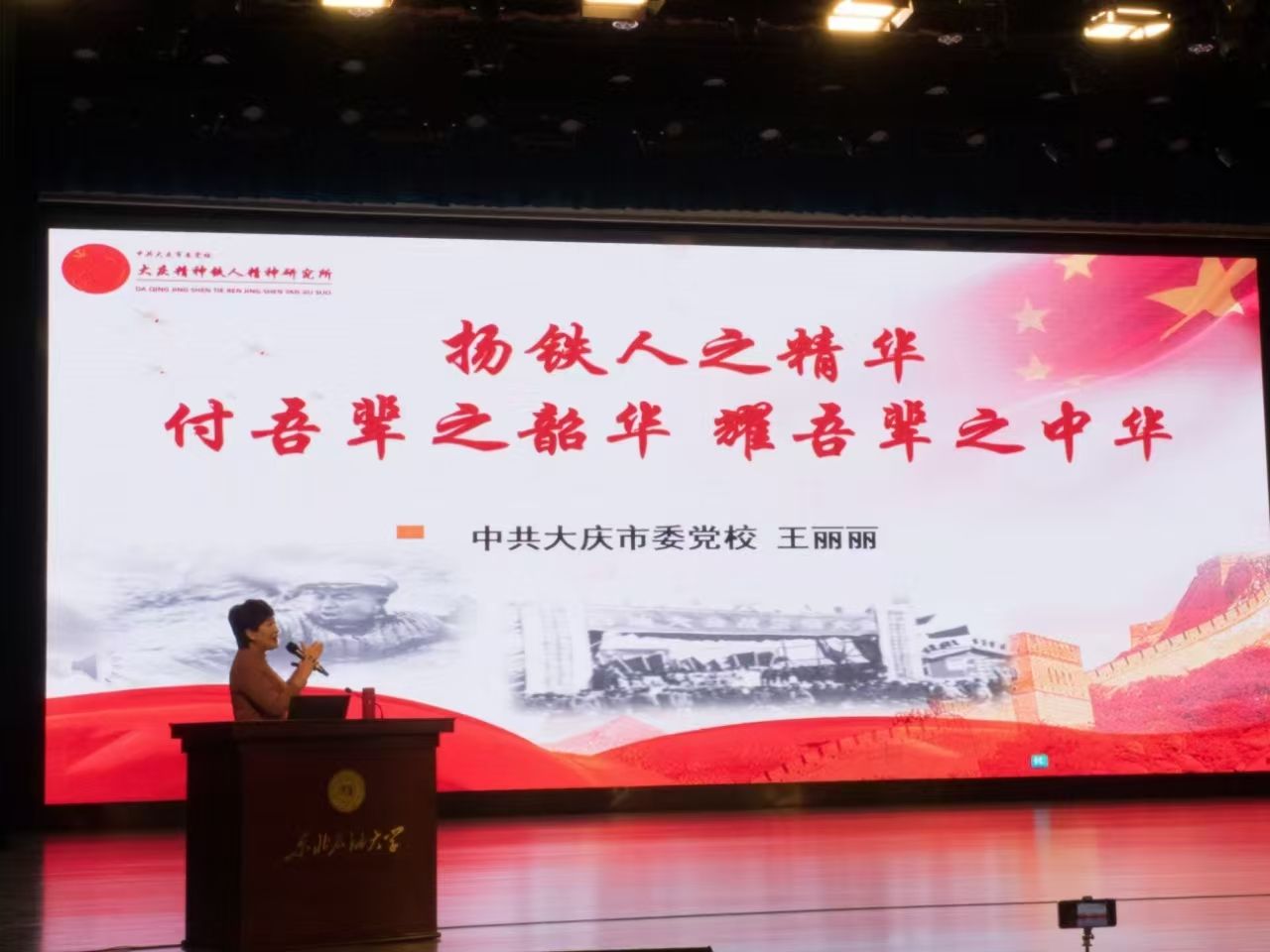 王丽丽教授以“扬铁人之精华 付吾辈之韶华 耀吾辈之中华”为主题,从寻根溯源、意蕴研究、传承庚续分析了铁人精神产生的时代背景、时代内涵、时代弘扬。她讲到,大庆精神铁人精神是中华民族的宝贵财富,是激励一代又一代大庆人勇往直前的动力源泉;她强调新时代好青年的标准,即有理想、敢担当、能吃苦、肯奋斗。她结合个人经历,讲述了大庆精神铁人精神助力她克服困难,激励她勇往直前。最后她寄语青年学子“青春逢盛世,拼搏正当时”,鼓励师生们要实干、敢干、能干,为国家能源事业贡献青春力量。
