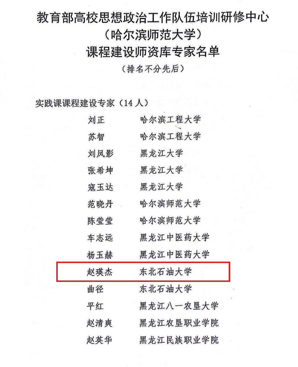 据悉,本次公布的课程建设师资库专家名单是教育部高校思想政治工作队伍培训研修中心(哈尔滨师范大学)在全省各高校推荐人选的基础上,聘任的首届专家,共29人,其中包含实践课程建设专家14人、理论课程建设专家15人。