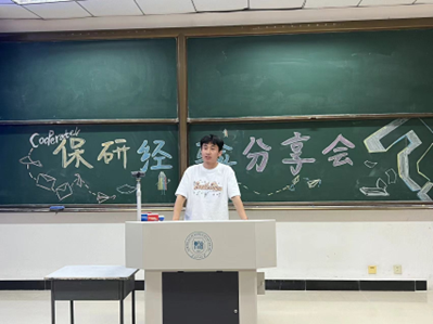 第一位为大家分享经验的学生是来自资源勘查工程20-2班的刘兴政同学,他以优异的成绩成功保研到中国石油大学(华东)。在交流中,刘兴政结合自身经历和学校对于保研的的要求进行了细致的讲解,让在场的同学们对自己能否保研以及如何保研有了一定的了解,同时,刘兴政就在场同学们的提问进行了细致的讲解、精到的回答,解开了同学们心中的疑团,使他们对保研的了解更加全面。