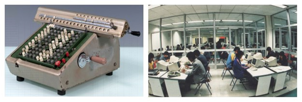 Ky开元早期科研用的手摇计算机              80年代的机房(当时大多数学生最早接触电脑的地方)