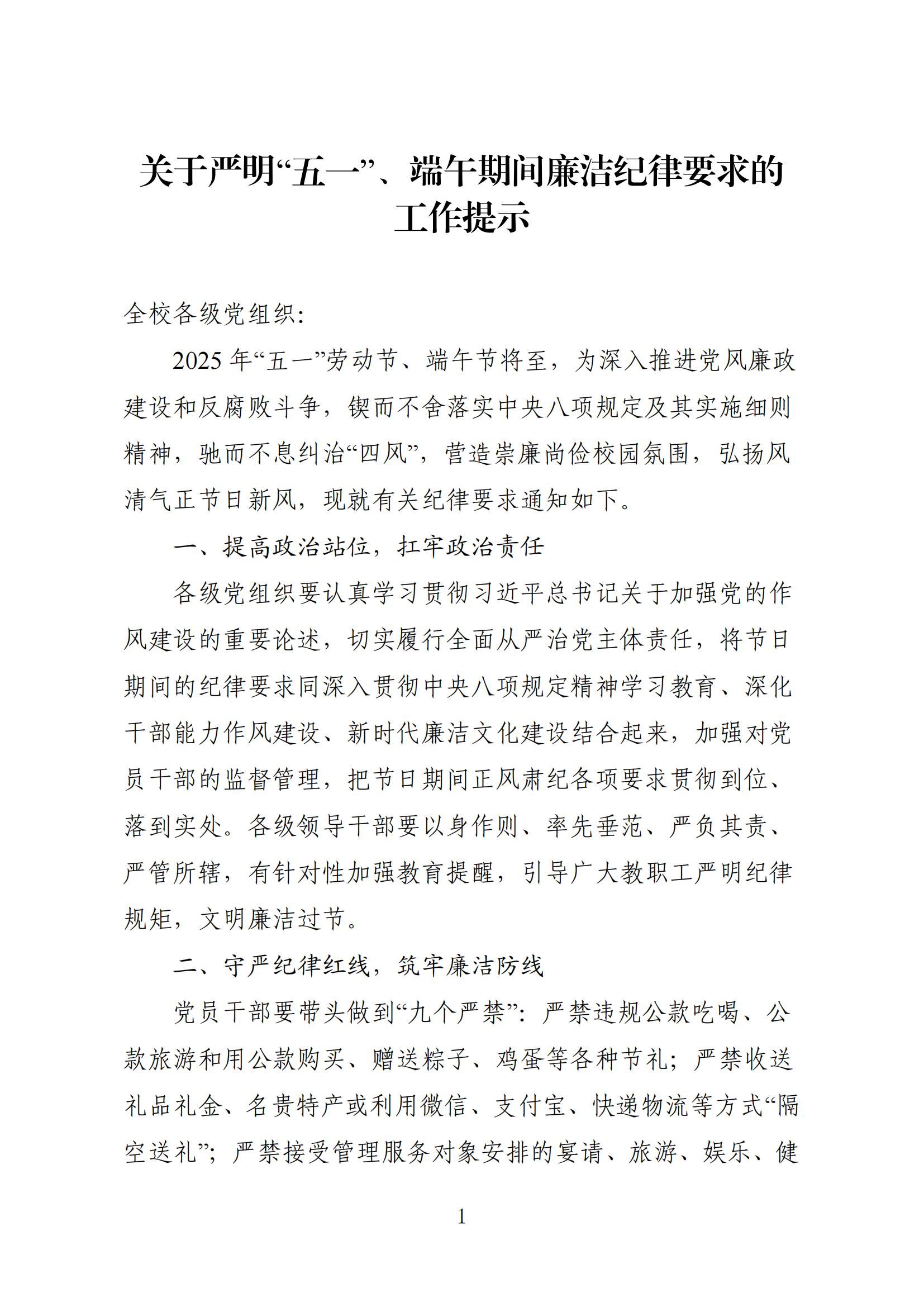 关于严明“五一”、端午期间廉洁纪律要求的工作提示
