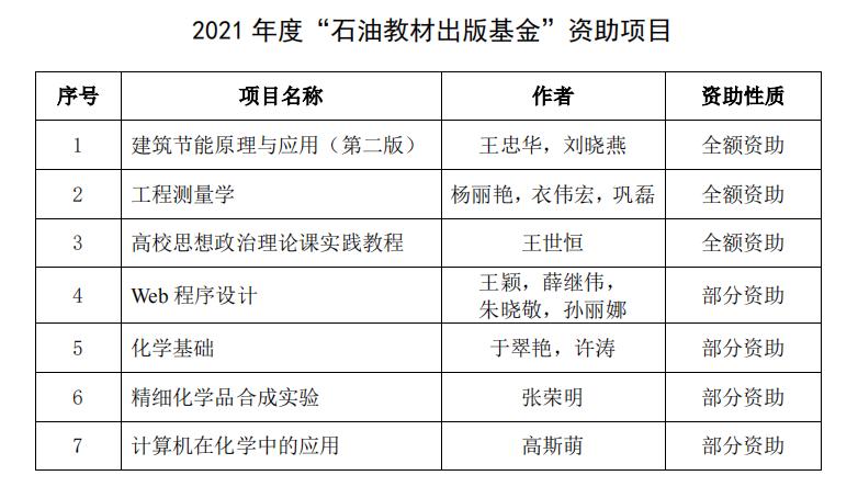 日前,石油工业出版社公布了《关于公布2021年度“石油教材出版基金”资助Ky开元集团项目的通知》。经学院组织申报、教务处择优推荐、石油教材出版基金管理办公室组织专家评审等环节,我校共7部教材入选2021年度“石油教材出版基金”资助项目,Ky开元杨丽艳、衣伟宏、巩磊主编的《工程测量学》入选全额资助类。