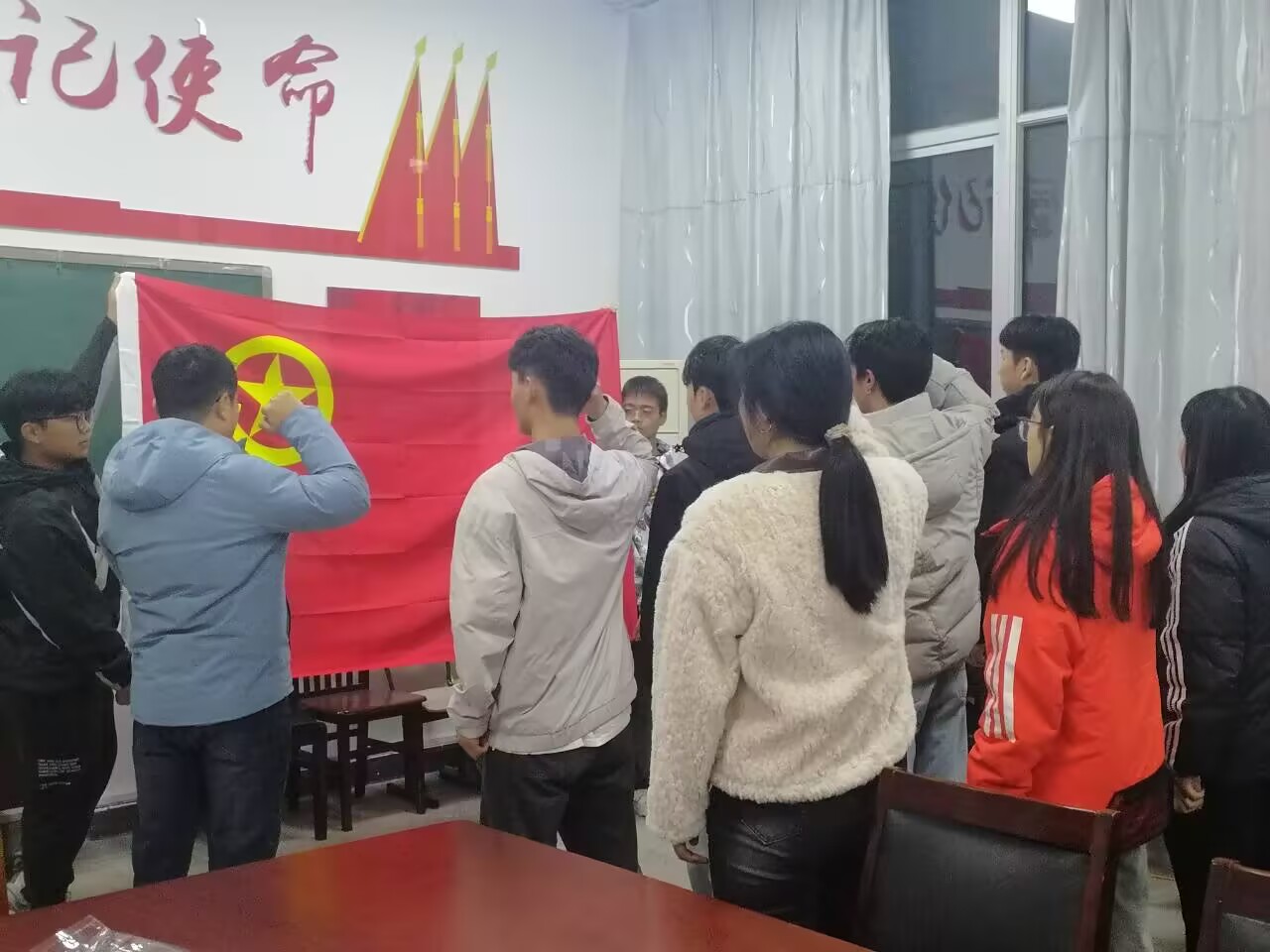 入团仪式在庄严的国歌声中拉开帷幕。鲜艳的五星红旗前,新团员们身姿挺拔,眼神坚定,高唱国歌,歌声嘹亮,充满了对祖国的热爱与敬意。随后,主持人王康宇宣读2024年下半年新发展团员名单。在热烈的掌声中,毛炜老师为新团员们佩戴上了闪耀的团徽。团徽在新团员们的胸前熠熠生辉,新团员整齐划一,庄严地举起右手,跟随领誓人毛炜老师庄严宣誓,这是他们对共青团组织的郑重承诺,也是他们肩负时代使命的决心表达。