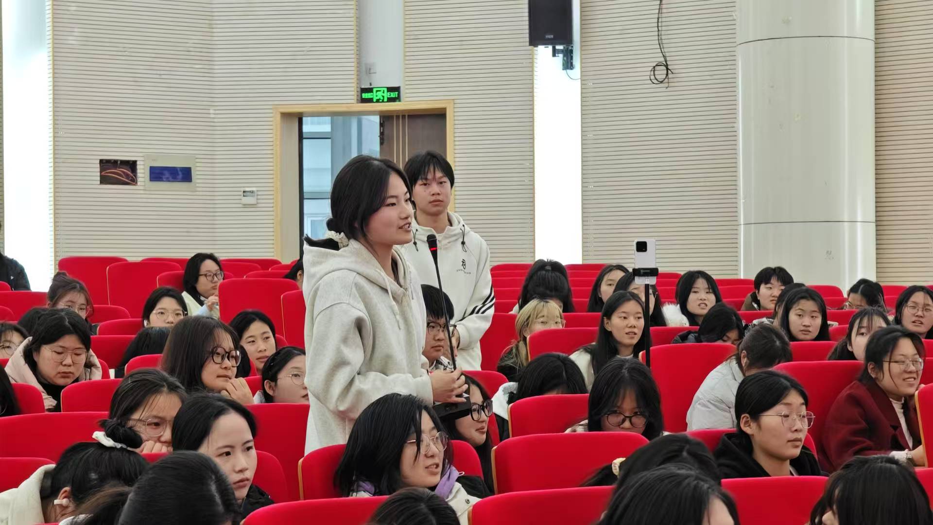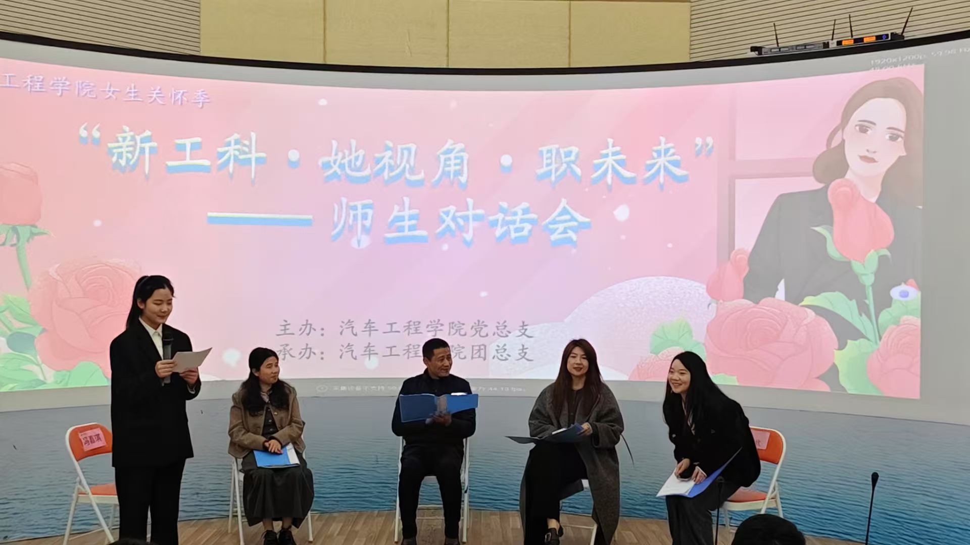启动仪式结束后,“新工科・她视角・职未来” 师生对话会正式开场。本次对话会由 23汽营一班冯嘉琪主持,通过线下讨论与线上抖音直播的形式,吸引了全院女生及众多线上观众参与。