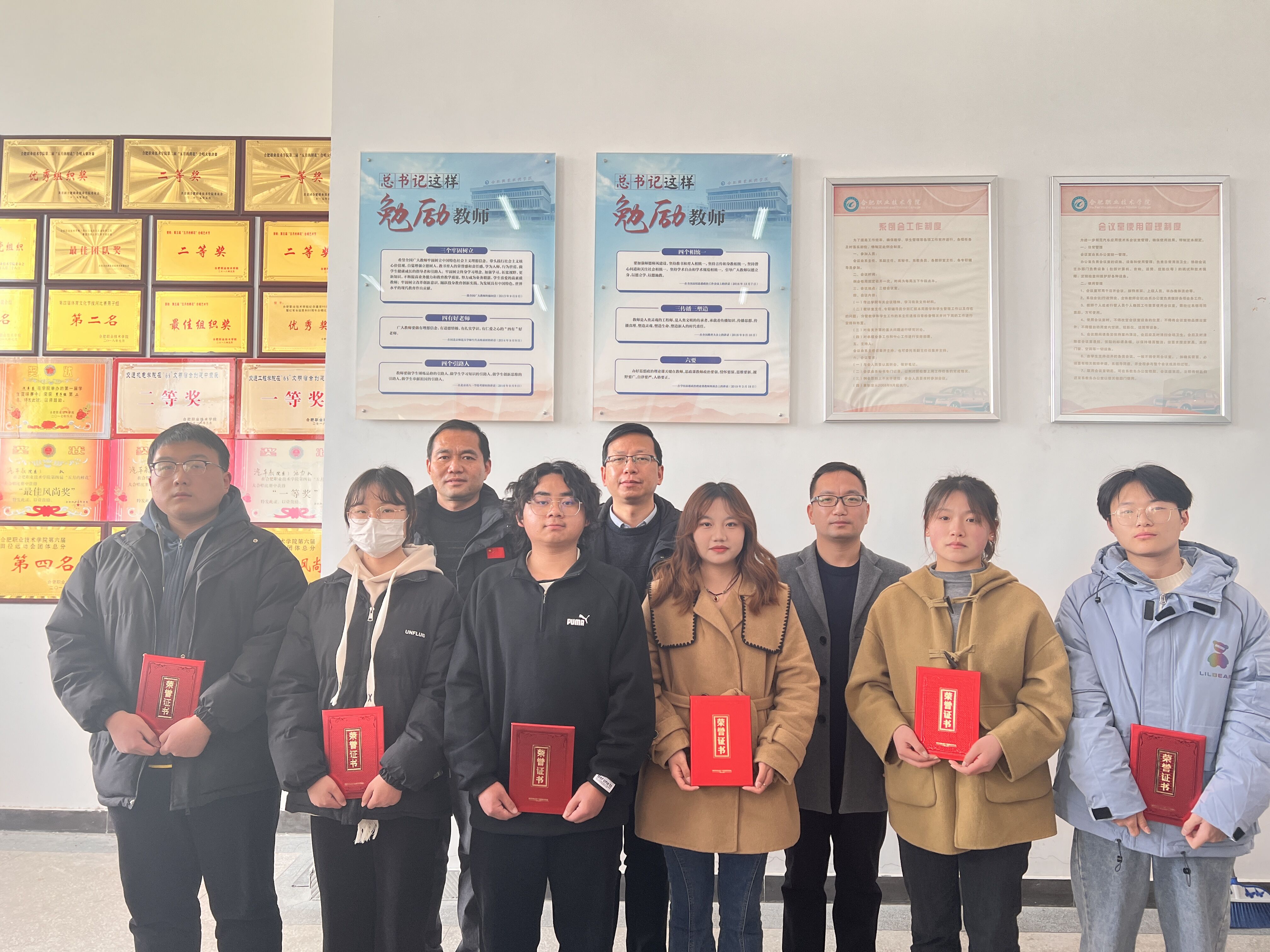 颁奖仪式上,学校党委委员、办公室主任、学院党总支书记王海,学院党总支副书记刘靖,学管办主任张升元等为获奖同学颁奖并合影留念。王海对征文获奖同学表示祝贺,肯定了学生们在此次比赛的精彩表现,鼓励同学们今后要进一步增强社会责任感和使命感,在未来的学习和工作中要发扬不畏艰苦、执著追求、精益求精的劳动精神,努力使自己成长为新时代汽车专业的“工匠”型人才。