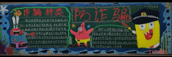 此次活动受到了2021级各班级的高度重视,从板报样式选定到板报创作再到上色和文字书写,各班级都做了精心准备,配备了充足的人力、物力和财力资源。有的班级绘出网络诈骗漫画告诫同学预防照片;有的班级则搬上了“国家反诈中心”APP图标警示网络诈骗。此次活动的举办,提高了betway西汉姆联官网师生的防范电信网络诈骗安全意识,使我院学生对于诈骗的形式和内容有了更进一步的了解。